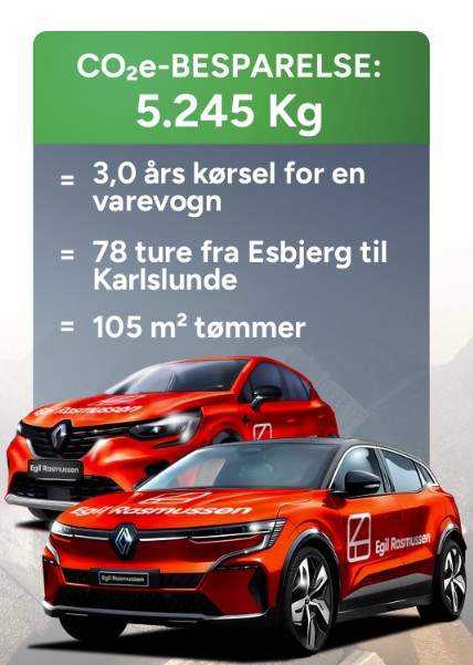 Med seks elbiler svarer det til en samlet besparelse på 5.245 kg CO₂e. Det svarer til cirka tre års kørsel i en varevogn, 78 ture fra Esbjerg til Karlslunde eller 105 m² tømmer.