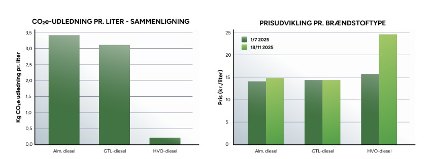Vi har også undersøgt alternative brændstoffer som GTL og HVO i forhold til CO₂e og økonomi. Sammenligningen viser, at GTL giver en mindre reduktion i CO₂e i forhold til almindelig diesel, mens HVO har et markant lavere CO₂e-aftryk pr. liter.