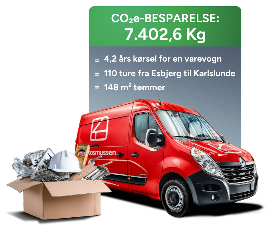 Det seneste år har vores håndtering af elektronik samlet givet en dokumenteret CO₂e besparelse på 7.402,6 kg. Besparelsen svarer til 4,2 års kørsel i en varevogn, 110 ture fra Esbjerg til Karlslunde eller 148 m² tømmer.