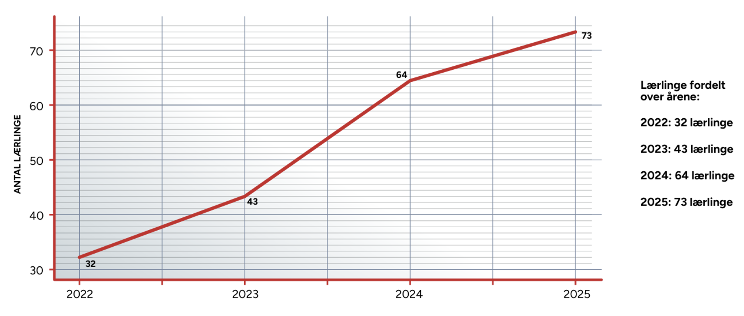 Det er vores mål altid at have 14 % tømrerlærlinge ansat, og det er underordnet for os, hvilken alder og hvilket køn lærlingene har. Lærlingene er jævnt fordelt på lærlingetrin 1 til 4.